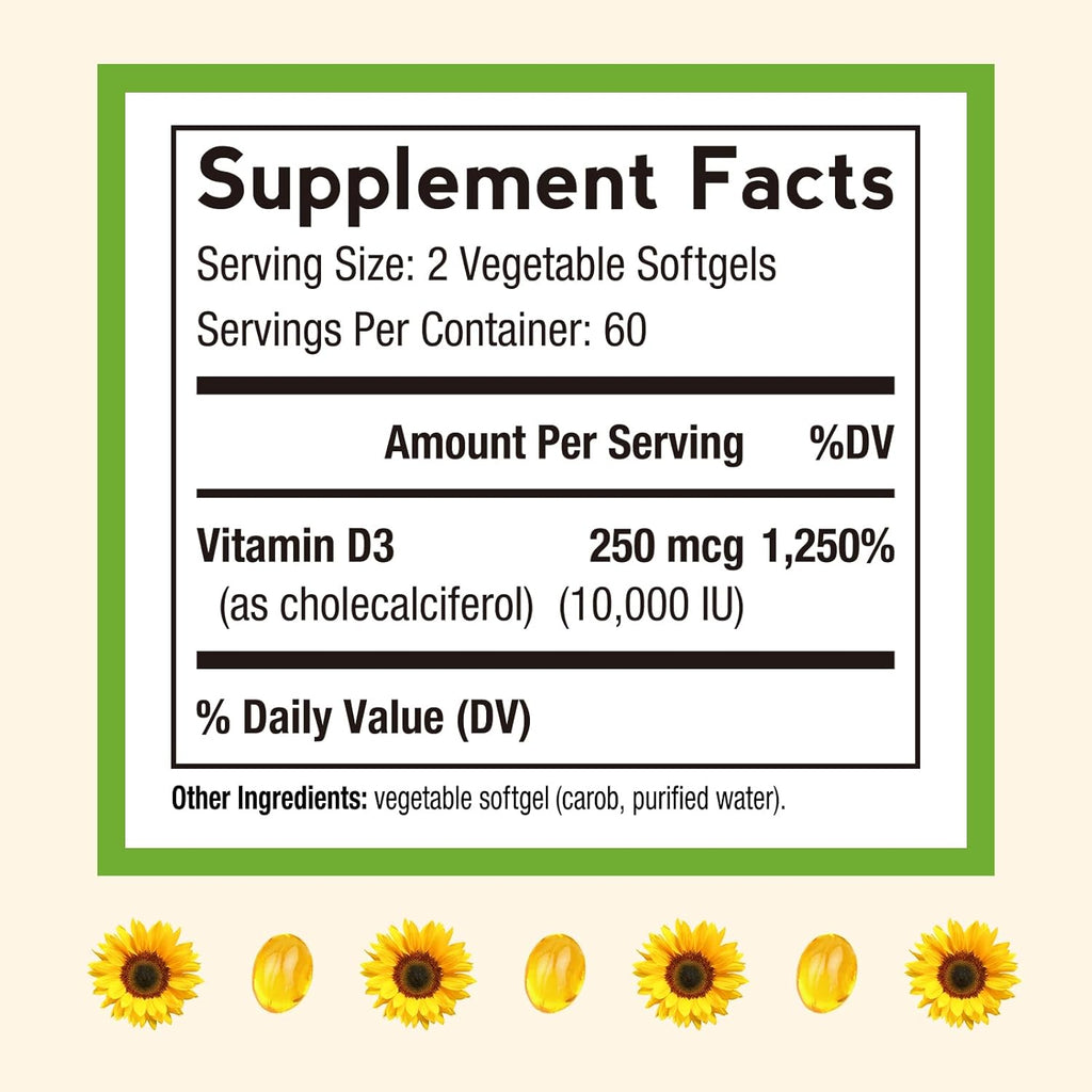 - Sunshine in a Bottle: Did you know that approximately 75% of Americans are deficient in vitamin D3? Whether it’s long winter months, rainy days, or simply limited access to sunlight, we all need a nice blast of Vitamin D. In one easy to take, vegetable softgel, Doctor’s Recipes delivers 10000 IU of this essential vitamin as D3 - the same form your body naturally produces from sunlight - to help replicate the benefits of natural sunlight with minimum UVB exposure.*