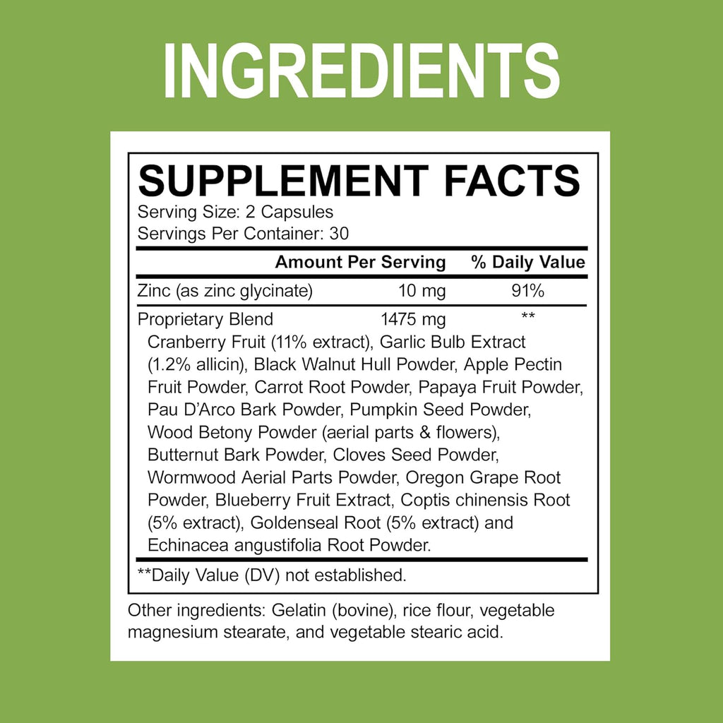 Per serving (1 cap): Zinc 10mg, Proprietary Blend (1475mg): Cranberry Fruit (11% Extract), Garlic Bulb Extract, Black Walnut Hull Powder, Apple Pectin Fruit Powder, Carrot Root Powder, Papaya Fruit Powder, Pau D’Arco Bark Powder, Pumpkin Seed Powder, Wood Betony Powder (aerial parts & flowers), Butternut Bark Powder, Cloves Seed Powder, Wormwood Aerial Parts Powder, Oregon grape Root Powder, Blueberry Fruit Extract, Coptis chinensis Root (5% extract), Goldenseal Root (5% extract) and Echinacea anguvstifolia Root Powder. Other Ingredients: Gelatin (bovine), rice flour, vegetable magnesium stearate, and vegetable stearic acid.