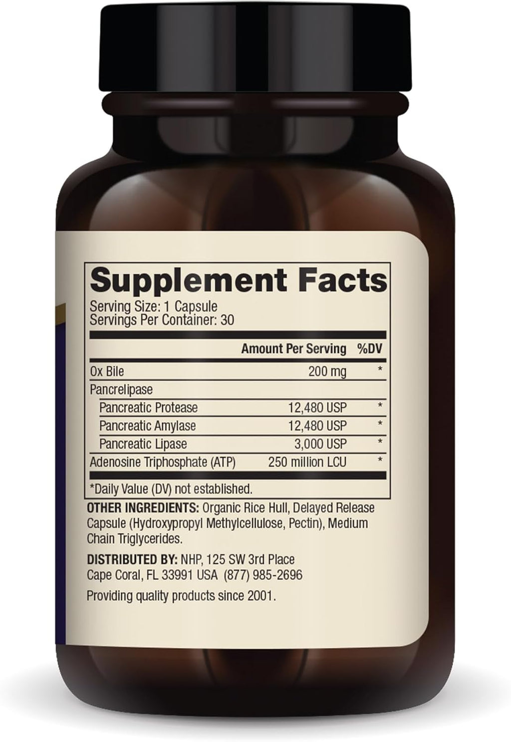 Ox Bile 200 mg * Pancrelipase Pancreatic Pancrelipase Pancreatic Protease 12,480 USP * Pancreatic Amylase 12,480 USP * Pancreatic Lipase 3,000 USP * Adenosine Triphosphate (ATP) 250 million LCU *OTHER INGREDIENTS: Organic Rice Hull, Delayed Release Capsule (Hydroxypropyl Methylcellulose, Pectin), Medium Chain Triglycerides.