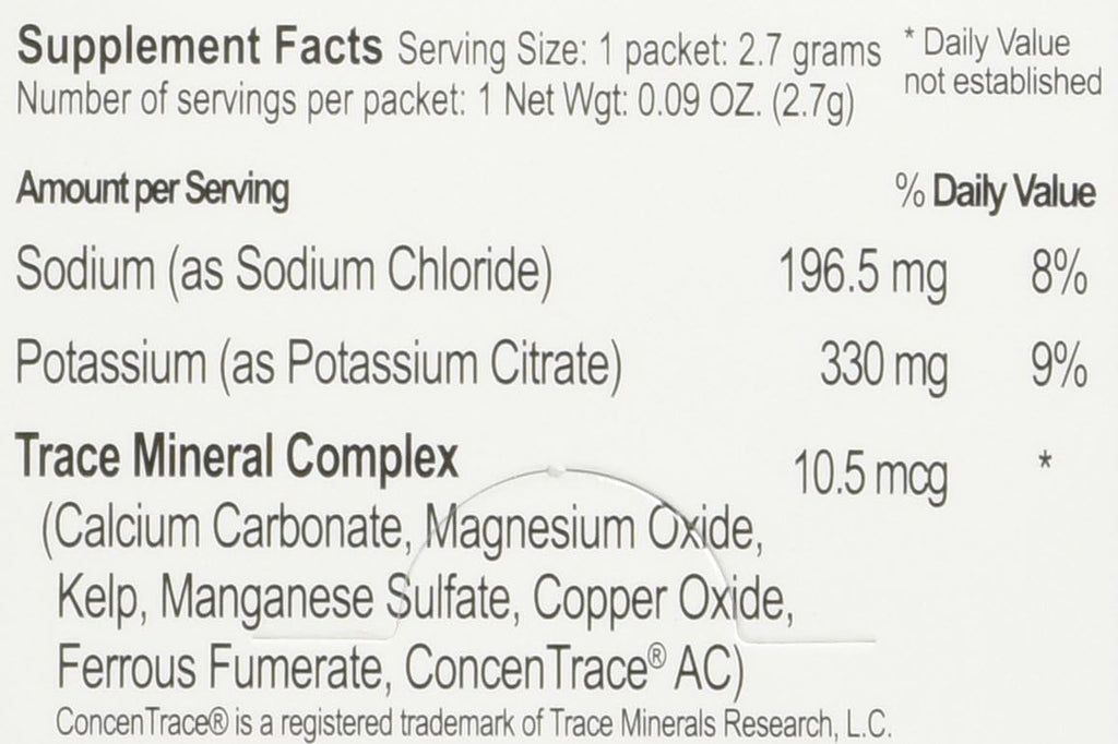 Sodium 200mg Potassium Citrate 330mg Trace Mineral Complex: 10.5mcg Calcium Carbonate, Magnesium Oxide, Iodine (From Kelp), Maganese Sulfate, Ferrous Fumerate, ConcenTrace® AC Other Ingredients: Citric Acid, Stevia Leaf Extract, Beta Carotene (color), Natural Key Lime and Lemon Fruit Extract