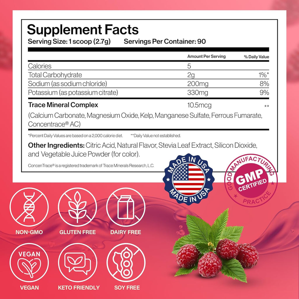 Sodium 200mg Potassium Citrate 330mg Trace Mineral Complex: 10.5mcg Calcium Carbonate, Magnesium Oxide, Iodine (From Kelp), Maganese Sulfate, Ferrous Fumerate, ConcenTrace® AC Other Ingredients: Citric Acid, Stevia Leaf Extract, Silicon Dioxide, Beet Powder (color), Natural Raspberry Fruit Extract