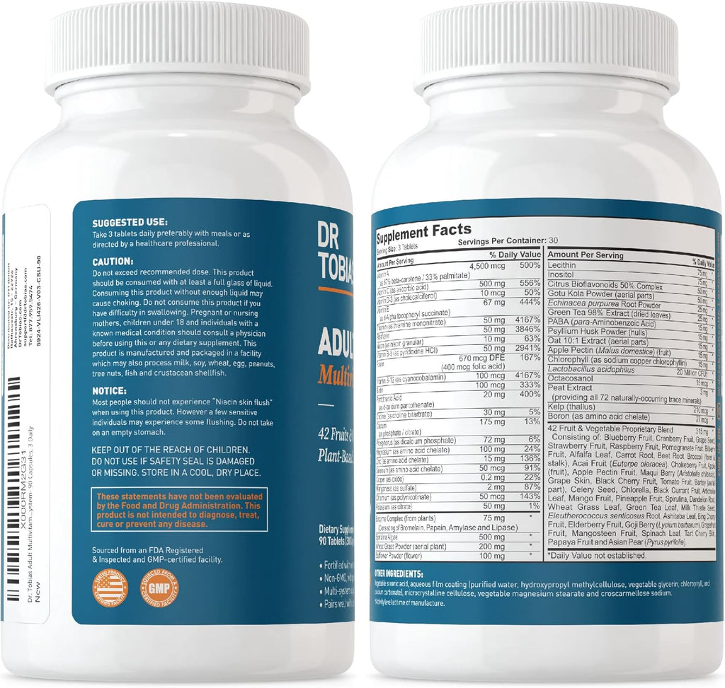 - Dr. Tobias Adult Multivitamin: Our Adult Multivitamin provides a comprehensive blend of essential nutrients, vitamins, and minerals, including Vitamins A, B12, C, D3, and E. Enhanced with probiotics and a fruit and vegetable complex, it supports immune health, energy levels, and overall wellness. Vegan, Gluten-Free, Non-GMO. 90 Tablets, 30 Servings.