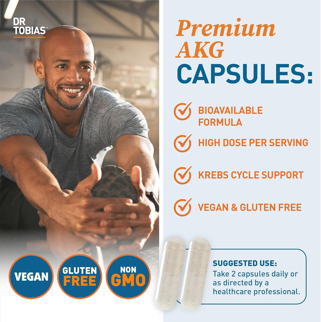 - Dr. Tobias AKG Supplement: Each serving delivers 1000mg of bioavailable Alpha-Ketoglutaric Acid (AKG). This key compound supports cellular energy production, muscle function, and overall metabolic health. It is formulated to help maintain vitality and wellness as you age, ensuring your body efficiently performs essential functions. Vegan, Gluten-Free, Non-GMO. 180 Capsules, 90 Servings.