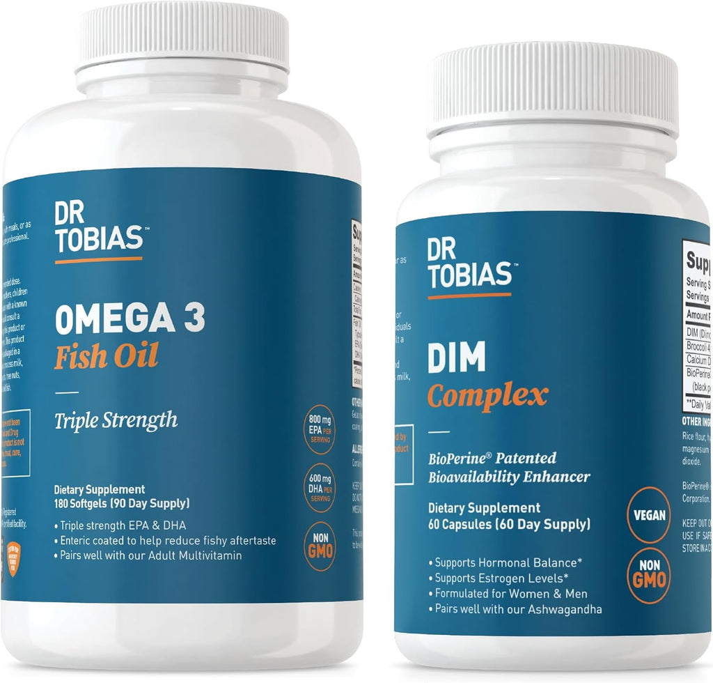 - Healthy Estrogen Balance for Overall Health: Elevate your wellness with the Dr. Tobias Omega 3 Fish Oil & DIM Complex. This combination is designed to support your body’s essential systems, offering comprehensive benefits for cognitive, immune, and hormonal health to help maintain balance, vitality, and overall well-being.
