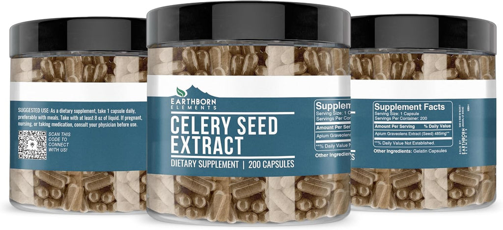 - Earthborn Elements Celery Seed Extract Capsules in a resealable plastic container