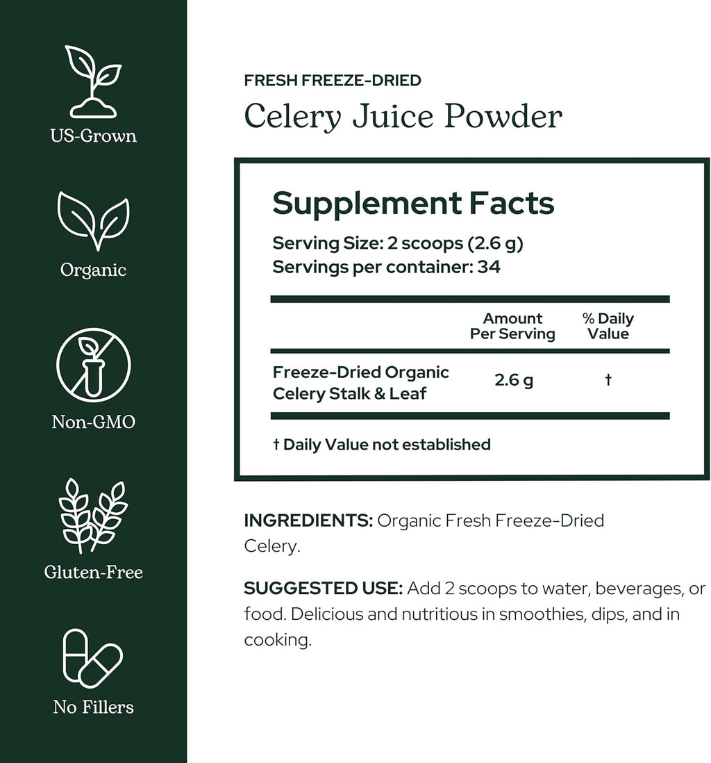 - CELERY JUICE POWDER: Your daily hydration and wellness boost. Rich in nutrients, essential vitamins, minerals, and antioxidants to support hydration and digestive wellness.