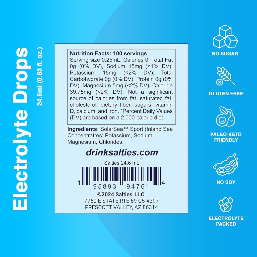 - ULTRA HYDRATION: The simple and MOST effective way to add essential electrolytes to your day without the hassle of flavorings. Salties electrolyte drops can hydrate UP TO 100 BOTTLES OF WATER! Get your electrolyte boost now and feel the difference.