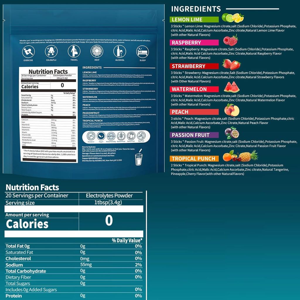 - PERFECT HYDRATION SET: OZENKE 20 sticks electrolytes sugar free, total 7 flavors, 3 sticks per 6 flavor including: lemon lime,watermelon,raspberry,strawberry,passion fruit,peach,2 sticks tropical punch flavors has tangy notes of tangerine,pineapple,cherry. Sugar free, gluten free and 0 Calorie, perfect for vegan and fasting. der for hydration and health, with pure natural organic fruits, Sodium,Calcium,Vitamin C,Potassium,Niacin,Vitamin B6,Vitamin B12,Pantothenic Acid,Magnesium,Zinc.