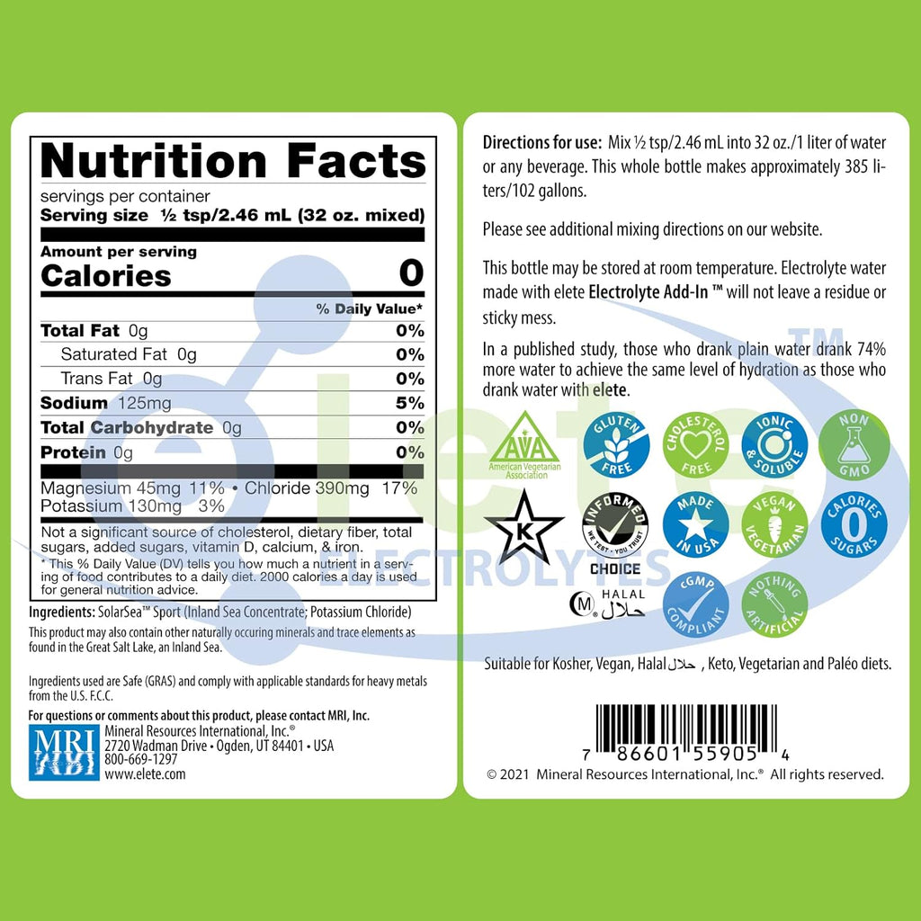 - EASILY MIXED WITH ANY BEVERAGE: elete Electrolyte Add-In Economy 4oz pure liquid electrolyte concentrate