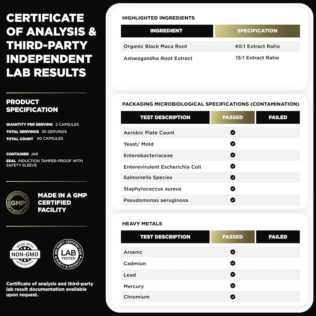 Organic Black Maca Root Extract, Ashwagandha Root Extract, BioPerineยฎ | Other Ingredients: Vegetable Capsule (hypromellose, purified water), Magnesium Stearate