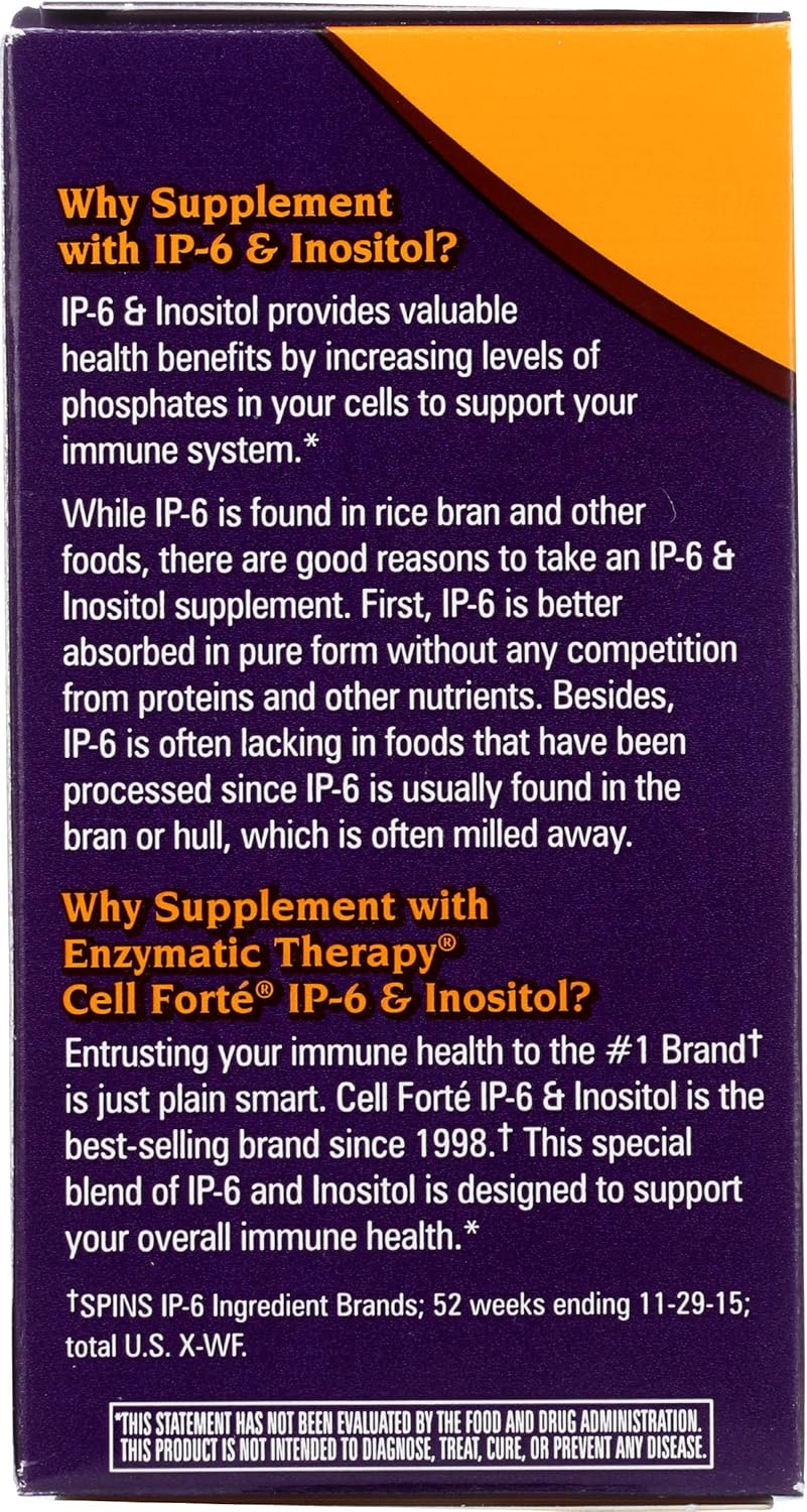 Enzymatic Therapy Cell Forte IP-6 and Inositol is a powerful dietary supplement designed to enhance immune system function and support natural killer (NK) cell activity. The combination of IP-6 (Inositol Hexaphosphate) and Inositol is specifically formulated to provide comprehensive immune support. This formula is enriched with essential nutrients that help promote overall health and well-being. The 120 veggie capsules offer a long-lasting, plant-based solution for those seeking natural immune support.