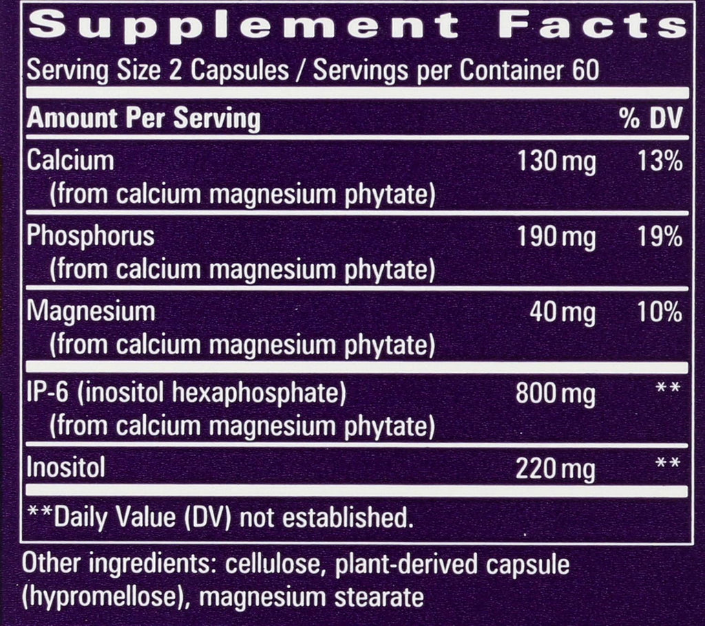 IP-6 (inositol hexaphosphate) from calcium magnesium phytate 800 mg, Inositol 220 mg, Cellulose, plant-derived capsule (hypromellose), magnesium stearate.