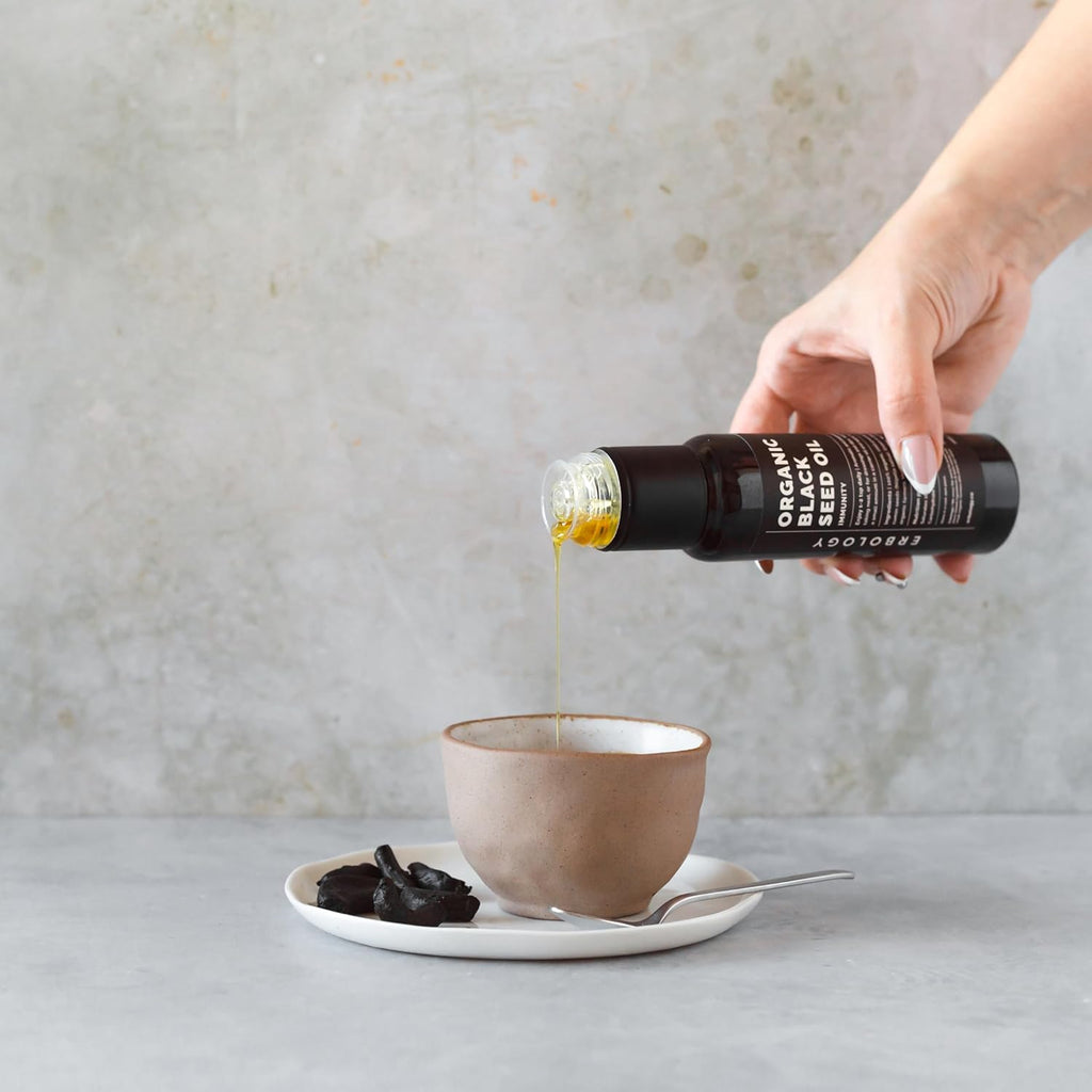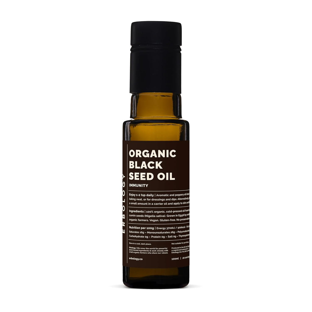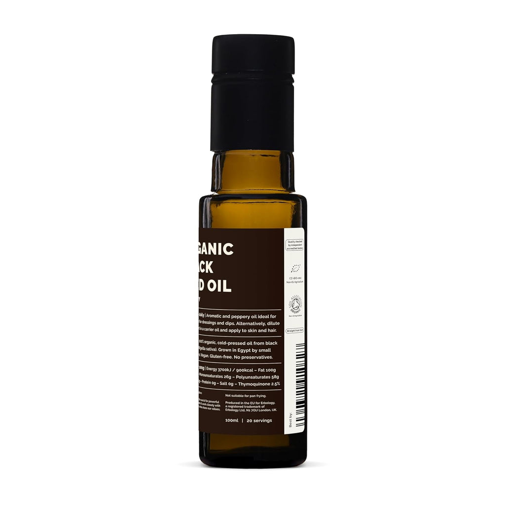100% organic, cold-pressed oil from black cumin seeds (Nigella sativa). Grown in Egypt by small organic farmers. Vegan. Gluten-free. No preservatives.