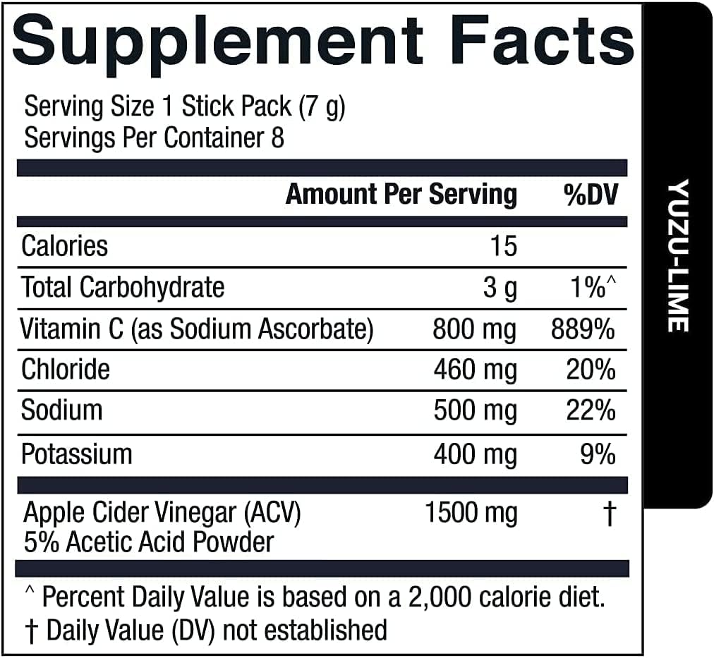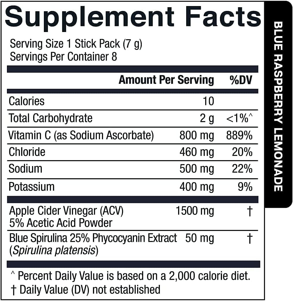 One Stick Pack: Calories 10, Total Carbohydrate 2 g, Vitamin C (as Sodium Ascorbate) 800 mg, Selenium 2.58 mcg, Chromium 2 mcg, Molybdenum 1.2 mcg, Chloride 460 mg, Sodium 500 mg, Potassium 400 mg, Apple Cider Vinegar 5% Acetic Acid Powder 1500 mg, Blue Spirulina 25% Phycocyanin Extract (Spirulina platensis) 50 mg. Other Ingredients: Citric Acid, Potassium Citrate, Sodium Ascorbate, Himalayan Sea Salt, Natural Flavors, Sodium Citrate, Organic Stevia Leaf, Malic Acid, Fumaric Acid.