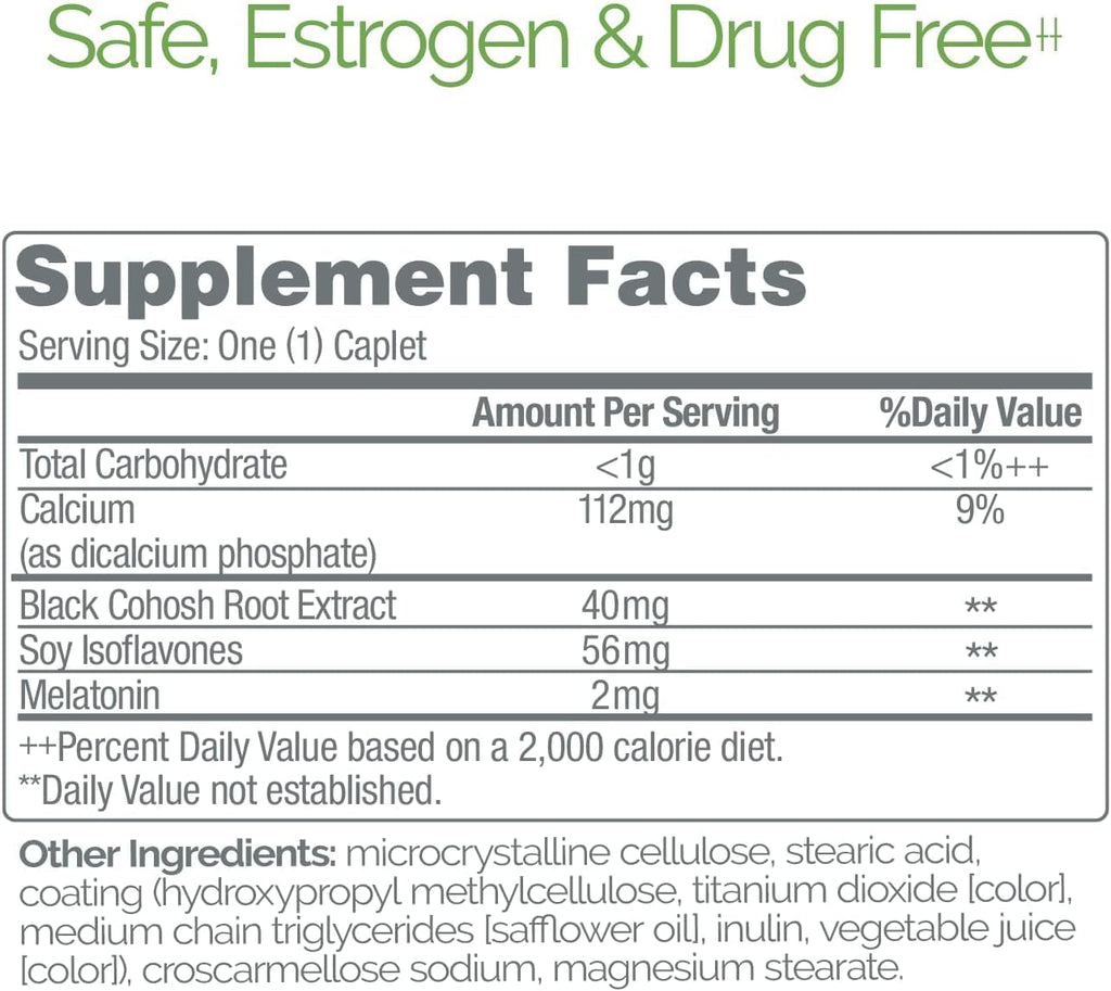 Safe & drug free caplets Helps you fall and stay asleep with Clinically Proven Melatonin* Black Cohosh helps to relieve hot flashes and night sweats* 30 or 60 Day Supply How It Works MELATONIN Clinically proven Melatonin, which promotes natural sleep and supports the regulation of circadian rhythms* BLACK COHOSH To help reduce the frequency and severity of hot flashes and night sweats.* PLANT-BASED-INGREDIENTS Soy Isoflavones and Black Cohosh plant-based ingredients don't raise estrogen levels, which could pose a health risk.* Did You Know? Occasional sleeplessness is one of the most common symptoms of menopause, and when you don’t get enough sleep day after day, it may lead to irritability, fatigue and stress. The Basics Night sweats and hot flashes associated with menopause can make falling asleep or staying asleep more difficult. Occasional sleeplessness is one of the most common symptoms of menopause, and when you don’t get enough sleep day after day, it may lead to irritability, fatigue and stress. Estroven Menopause Relief Sleep Cool is formulated with clinically proven Melatonin, which promotes natural sleep and supports the regulation of circadian rhythms, and Black Cohosh to relieve hot flashes and night sweats so you can rest and wake up feeling refreshed.* Directions for Use Take one caplet daily with or without food before bedtime. For best results, daily use for a minimum of 60 days is important. Ingredients Black Cohosh and Soy Isoflavones to help reduce the frequency and severity of hot flashes and night sweats.* Melatonin to help you fall asleep and stay asleep.*