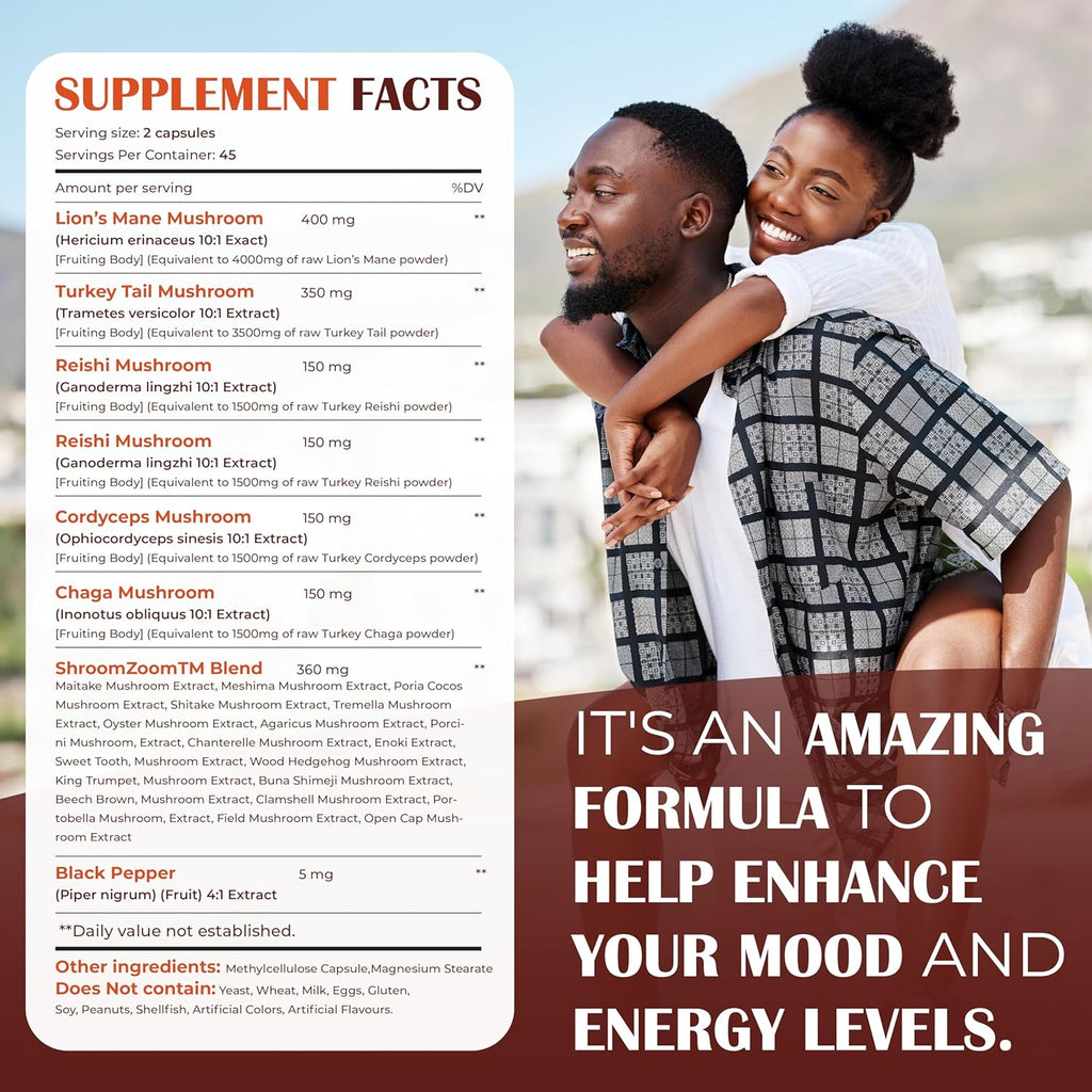 - NEW ADVANCED SHROOMZOOM BLEND - In addition to lions mane mushroom powder, turkey tail extract, reishi mushrooms, chaga mushroom powder, and cordyceps extract, our formula also contains 19 additional powerhouse mushrooms such as King Trumpet, Maitake, Meshima, Poria Cocos, Shiitake, Tremella, Portabella, Oyster, Agaricus, BeechBrown, Porcini, Enoki and more! These mushroom complex capsules are a powerful alternative to lions mane tea, reishi mushroom tea, reishi coffee, chaga coffee, lions mane tincture, echinacea, bee pollen, and lions mane gummies.