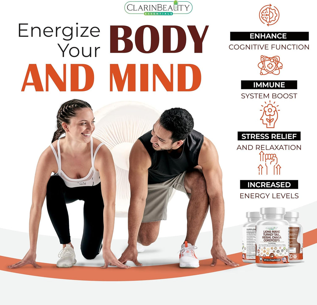 - PREMIUM MUSHROOM SUPPLEMENT For Women & Men - Our mushrooms complex includes 24 different types of mushroom extract such as lions mane mushroom capsules, turkey tail mushroom extract, reishi mushroom powder, chaga mushrooms capsules, and cordyceps sinensis. A potent Lions Mane Mushroom Supplement with lions mane extract has been created and the results are amazing. ClarinBeauty's all-in-one lions mane supplement includes turkey tail mushroom capsules, chaga mushrooms powder and more.