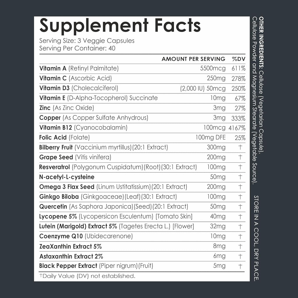 - Comprehensive Vitamin & Mineral Blend for Eye Support - Get a full spectrum of eye-nourishing nutrients with Vitamin A, Vitamin C, Vitamin B12, and zinc! This powerhouse formula also includes folate, CoQ10, and a variety of extracts like bilberry, grape seed, and ginkgo biloba, working together to deliver robust antioxidant support for your eyes.