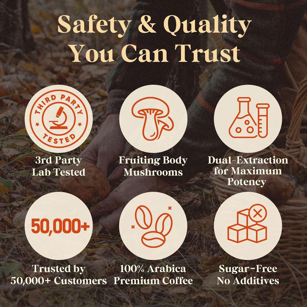 - 100% SATISFACTION GUARANTEE: Made with 100% fruiting body mushrooms and dual-extracted for optimal potency. We're committed to supporting your wellness journey. If you're not fully satisfied with our mushroom coffee blend, you can contact us via the Amazon messaging system for a refund or replacement. Your well-being is our top priority