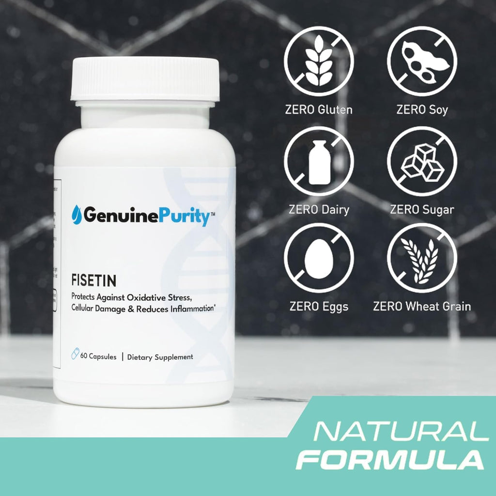 - NON-GMO INGREDIENTS - GenuinePurity Fisetin is made with organic and non-GMO ingredients. Our supplements are free from artificial additives and preservatives, ensuring a pure and potent formula.