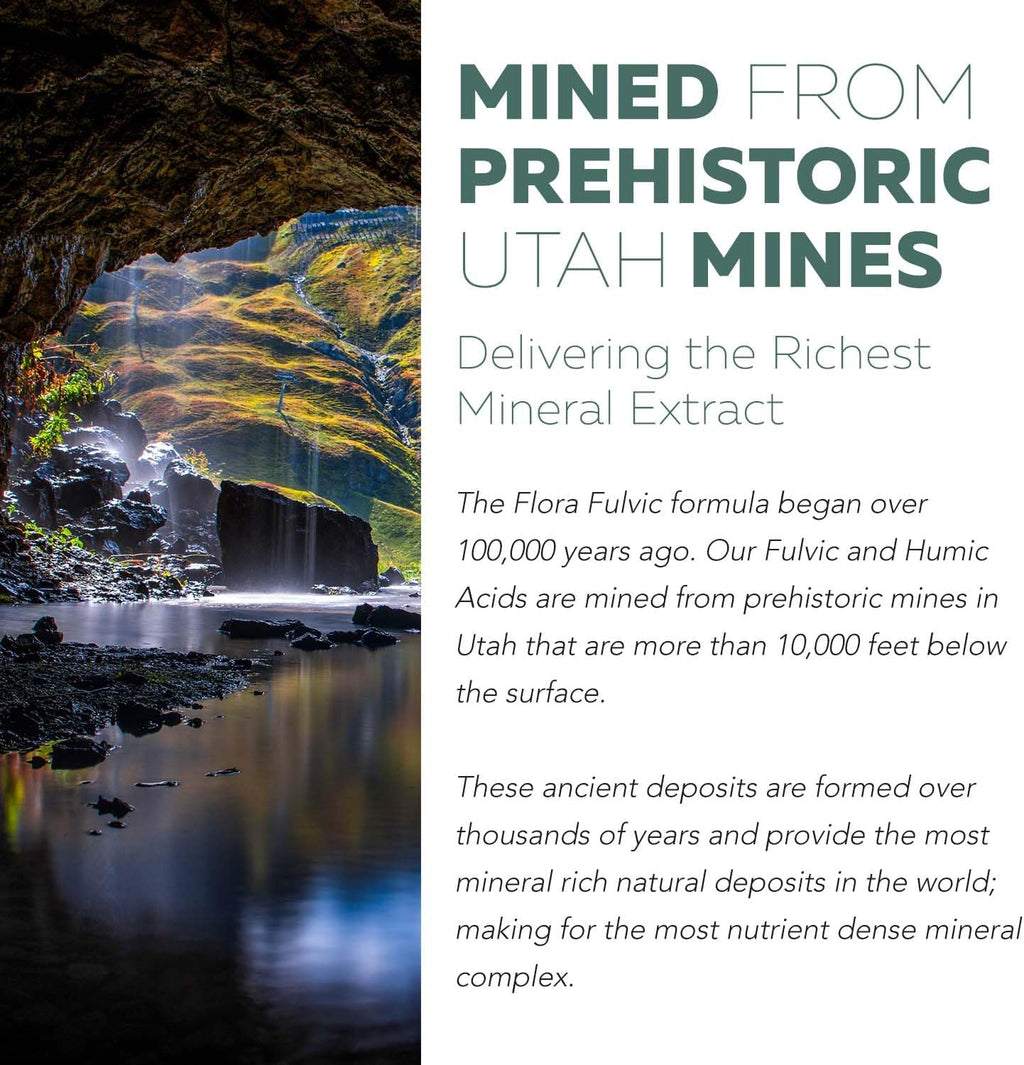 - MINED FROM PREHISTORIC DEEP-EARTH DEPOSITS | The Flora Fulvic formula began over 100,000 years ago. Our Fulvic and Humic Acids are mined from prehistoric mines in Utah that are more than 10,000 feet below the surface. These ancient deposits are formed over thousands of years and provide the most mineral rich natural deposits in the world; making for the most nutrient dense mineral complex.