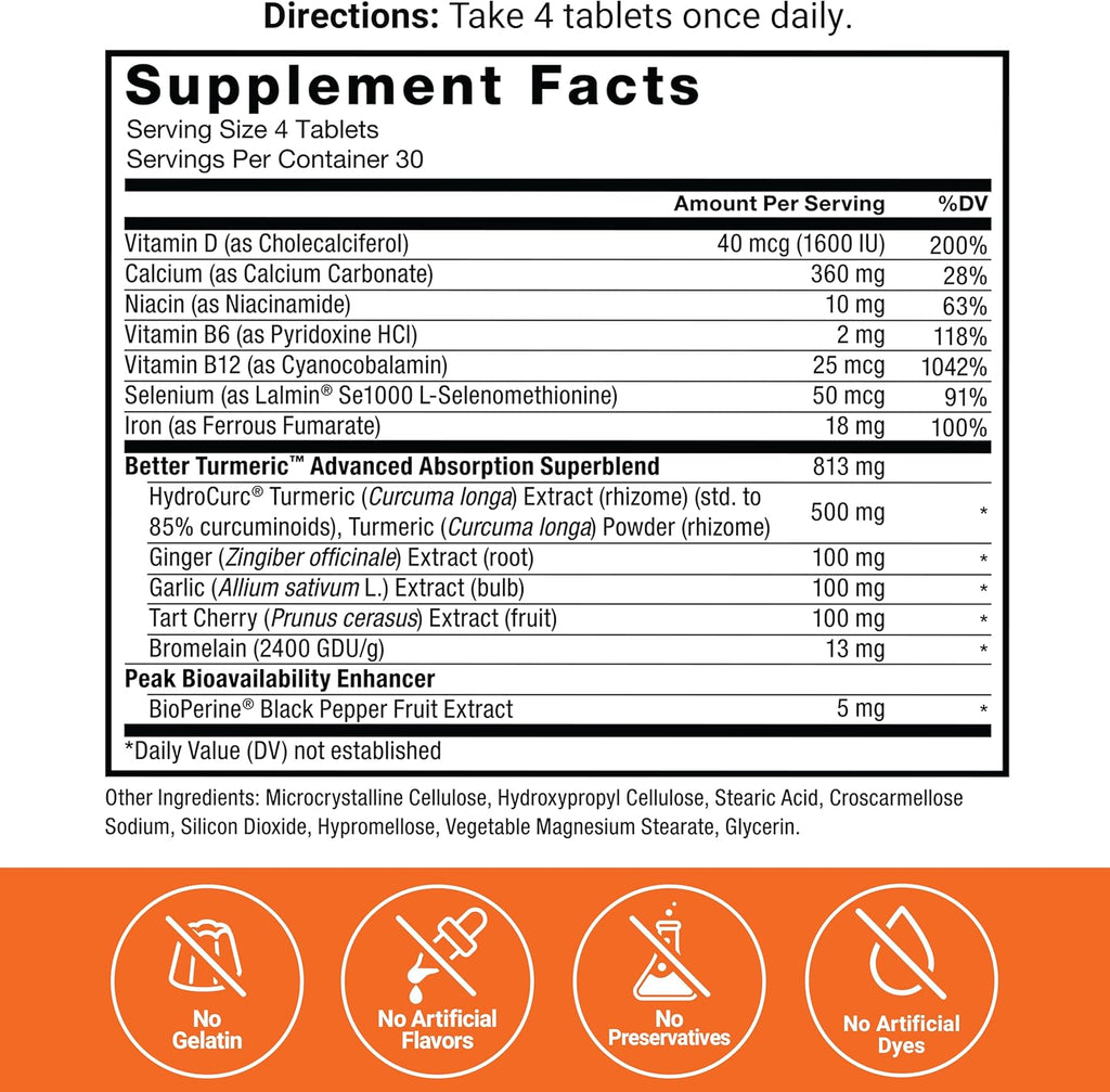 - BOOST ENERGY & STRENGTHEN IMMUNITY: Providing you with even more than the average joint support supplement, Better Turmeric Tablets also include vitamin D for immune health, and a potent dose of B vitamins to help boost energy for greater daily support.