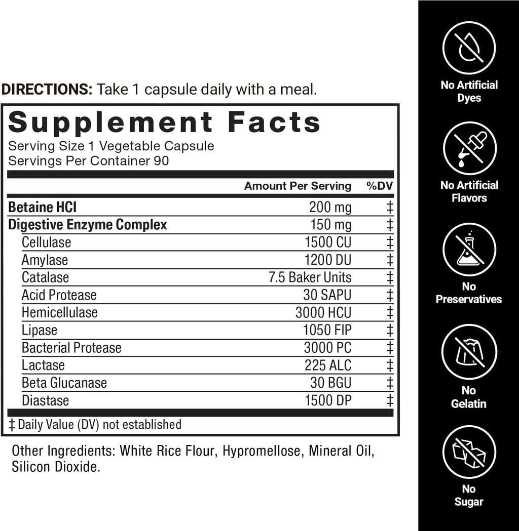 Betaine HCl, Digestive Enzyme Complex: Cellulase, Amylase, Catalase, Acid Protease, Hemicellulase, Lipase, Bacterial Protease, Lactase, Beta Glucanase, Diastase. Other Ingredients: White Rice Flour, Hypromellose, Mineral Oil, Silicon Dioxide.