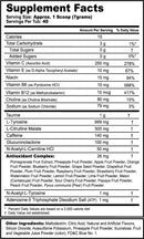 Energy Complex: Taurine, L-Citrulline Malate, Caffeine (150 mg), Glucuronolactone, N-Acetyl-L-Carnitine HCl, Velvet Bean (Mucuna pruriens) Seed Extract Focus Complex: L-Tyrosine, Choline Bitartrate, N-Acetyl-L-Tyrosine, Adenosine-5 Triphosphate Disodium Salt (ATP), Toothed Clubmoss Aerial Parts Extract, Bacopa Leaf Extract Antioxidant Complex: Pineapple Fruit Powder, Cabbage Palm Berry Powder, Pomegranate Fruit Powder, Apple Fruit Powder, Orange Fruit Powder, Blueberry Fruit Powder, Grape Seed Powder, Grapefruit Fruit Powder, Plum Fruit Powder, Raspberry Fruit Powder, Strawberry Fruit Powder, Watermelon Fruit Powder, Lemon Fruit Powder, Lime Fruit Powder, Melon Fruit Powder, Sour Cherry Fruit Powder, Papaya Fruit Powder, Peach Fruit Powder, Pyrus communis Fruit Powder Other Ingredients: Maltodextrin, Malic Acid, Citric Acid, Natural and Artificial Flavors, Silicon Dioxide, Acesulfame Potassium, Sucralose, FD&C Blue #1.