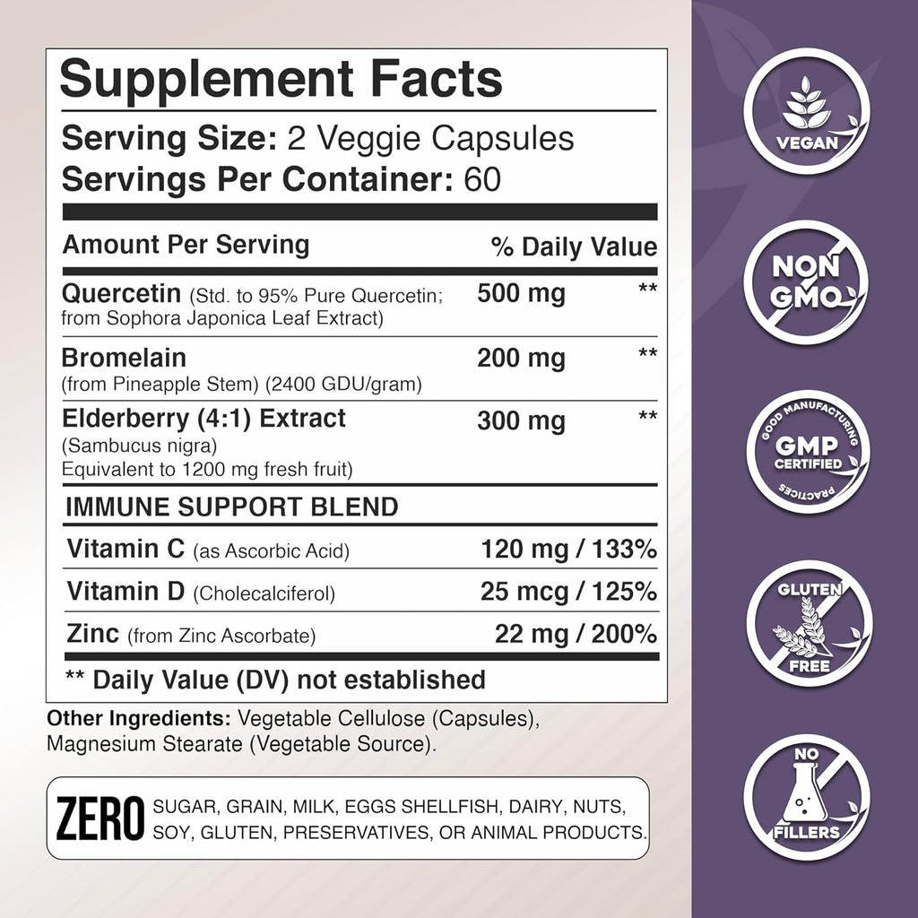 - Powerful Daily Immune Support: Stay one step ahead with Gade Nutrition’s Quercetin with Bromelain & Elderberry, a comprehensive formula designed to support your immune system and overall well-being. At the core is Quercetin, a naturally occurring flavonoid known for its ability to promote balance and resilience. Whether you’re managing a demanding schedule or changing seasons, this supplement helps reinforce your body's natural defenses.