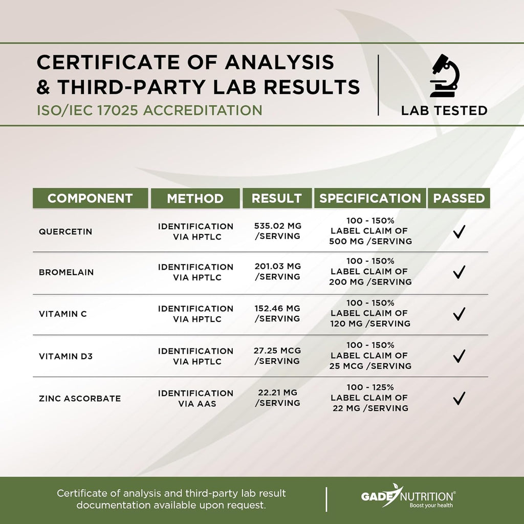 - A POTENT COMBINATION TO BOOST THE IMMUNE SYSTEM: Quercetin is a flavonoid (plant pigment) naturally found in fruits and vegetables. It is found in many foods, such as red wine, onions, green tea, apples, berries, and more. It is known for its antioxidant properties. Quercetin Supplements by Gade Nutrition offer the finest ingredients including a proprietary blend of Quercetin, Bromelain, Vitamin C, Vitamin D, and zinc. Quercetin with Bromelain supports immune health and overall well-being
