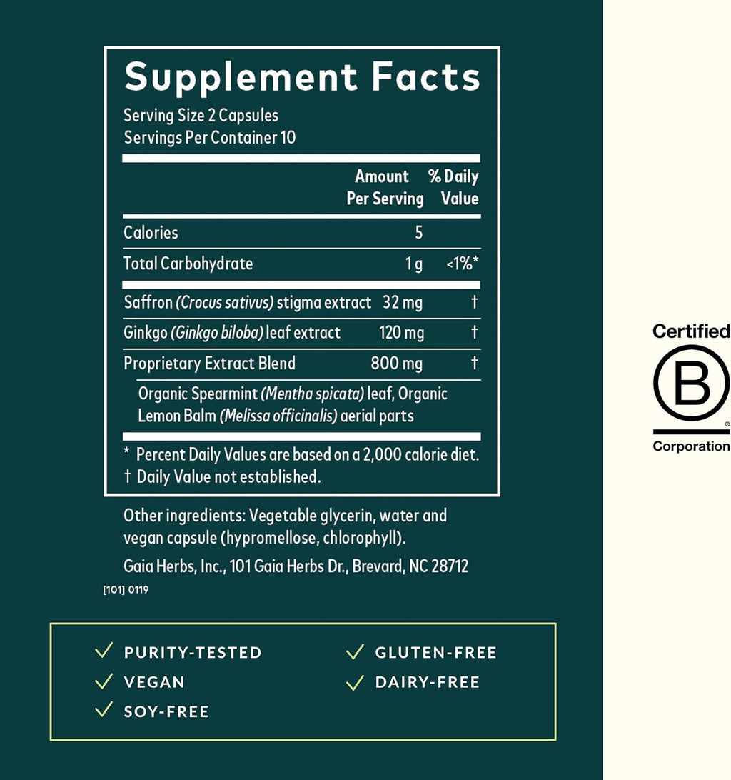 A targeted formula for healthy concentration, Gaia Herbs nootropic focus helps you keep up with the competing demands of a fast-paced life. For the do-it-all parent balancing work and home duties, or the active professional looking for support for the next big idea, nootropic focus helps maintain overall cognitive health so you can thrive in your busy life. Made with a revitalizing blend of saffron, lemon Balm, and Spearmint. Saffron is traditionally used to support overall brain health, promoting attention and reflection. Lemon Balm supports mental alertness and focus, and Spearmint is invigorating and uplifting for the mind and body and helps maintain mental performance.