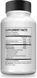 Vitamin C (Ascorbic Acid), Potassium, Alpha-Lipoic Acid, Gymnema Sylvestris Leaf Powder, Cinnamon Bark Powder, Licorice Root Powder, White Willow Bark Extract (25% Salicin), Berberine HCI, Microcrystalline Cellulose, Magnesium Stearate, Silicon Dioxide.