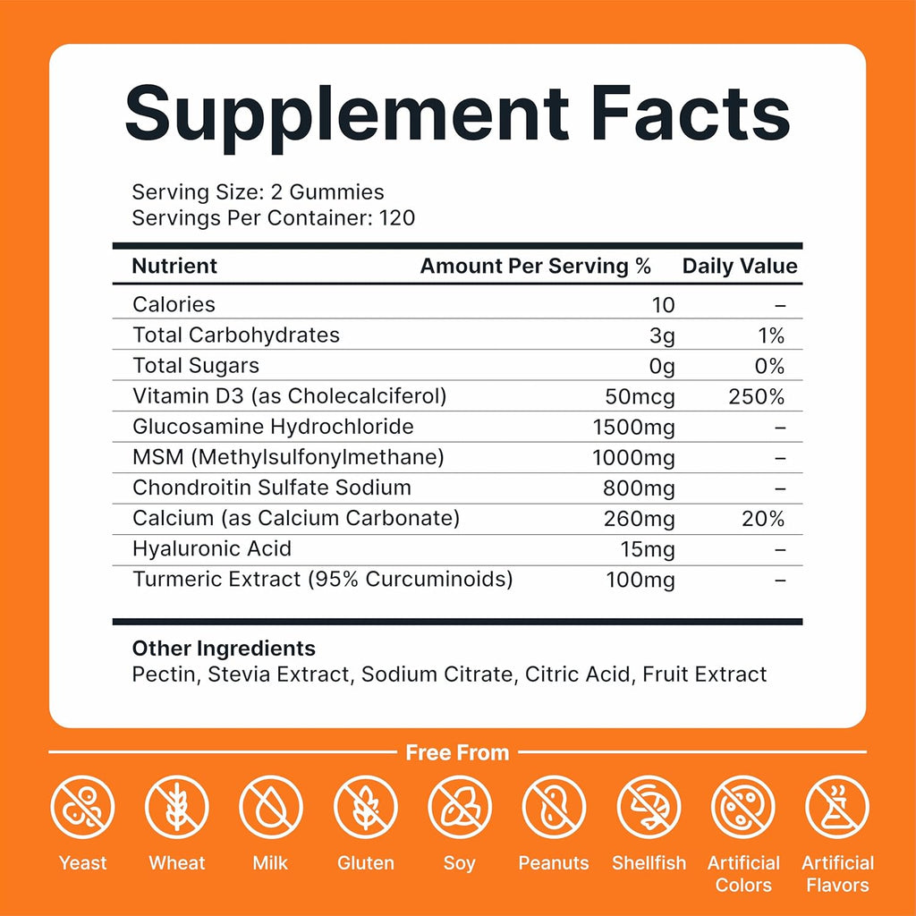 - EASY-TO-TAKE GUMMIES 2 MONTH SUPPLY - Say goodbye to capsules and powders. Our convenient chewable joint support gummies make it simple to stay consistent, providing 60 delicious servings packed with powerful glucosamine, chondroitin, MSM, and turmeric for daily joint comfort.