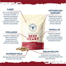- NATURAL HEARFT HEALTH SUPPLEMENTS: Beef heart is one of the richest, naturally occurring sources of CoQ10 which supports healthy mitochondria and cardiac muscle. Our beef organs supplement for men and women is made only from locally sourced grass fed beef, flash frozen after processing and immediately transported to our facilities ensuring you are receiving the freshest and highest quality production product.