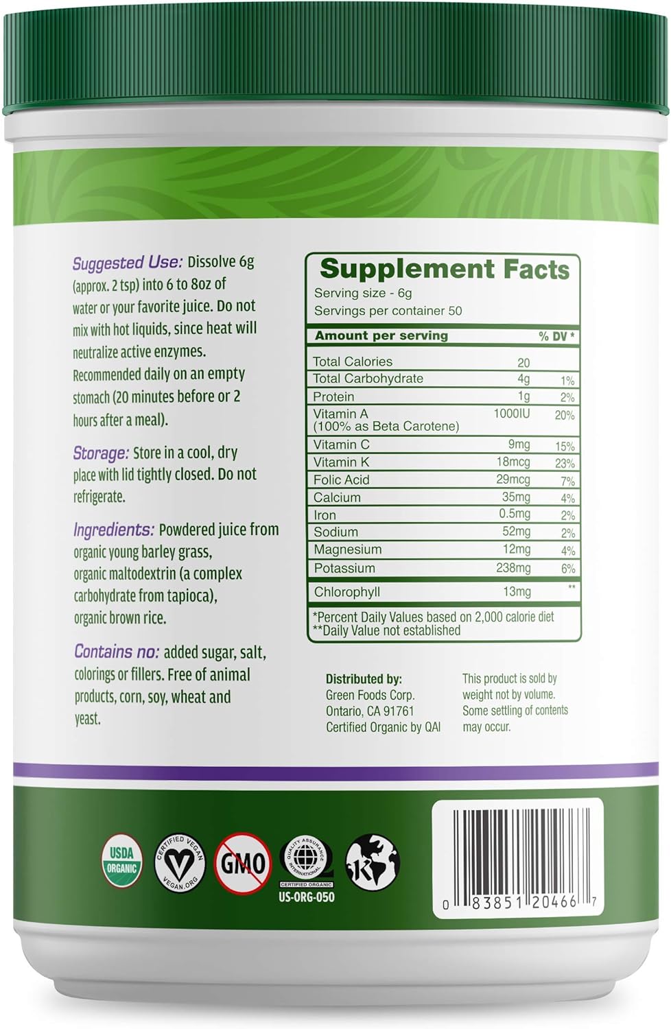Total Total Calories Amt Per Serving:20 % Daily Value :N/A,Total Carbohydrate Amt Per Serving:4 g % Daily Value :1%,Protein Amt Per Serving:1 g % Daily Value :2%,Vitamin A (100% as beta carotene) Amt Per Serving:1000 IU % Daily Value :20%,Vitamin C Amt Per Serving:9 mg % Daily Value :15%,Vitamin K Amt Per Serving:18 mcg % Daily Value :23%,Folic Acid Amt Per Serving:29 mcg % Daily Value :7%,Calcium Amt Per Serving:35 mg % Daily Value :4%,Iron Amt Per Serving:0.5 mg % Daily Value :2%,Sodium Amt Per Serving:52 mg % Daily Value :2%,Magnesium Amt Per Serving:12 mg % Daily Value :4%,Potassium Amt Per Serving:238 mg % Daily Value :6%,Chlorophyll Amt Per Serving:13 mg % Daily Value :N/A,Daily value not established.,Other Ingredients: Powdered juice from organic young barley grass, organic maltodextrin (a complex carbohydrate from tapioca), organic brown rice.