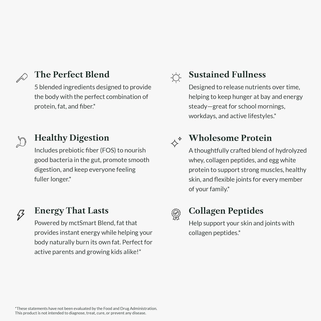 - Wholesome Protein for the Whole Family. A thoughtfully crafted blend of hydrolyzed whey, collagen peptides, and egg white protein to support strong muscles, healthy skin, and flexible joints for every member of your family.