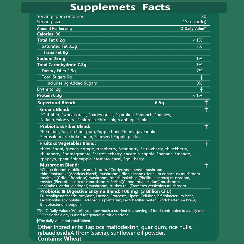 - Unlock the Power of Greens & Superfoods: Experience a nutrient-packed boost with our Greens & Superfoods blend, featuring a combination of 50 carefully selected ingredients designed to support your overall health. This premium mix includes greens, fibers, fruits, vegetables, mushrooms, and probiotics to help you feel your best every day.