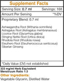Ashwagandha Root (Withania somnifera), Astragalus Root (Astragalus membranaceus), Licorice Root (Glycyrrhiza glabra), Stinging Nettle Root (Urtica dioica), Rhodiola Root (Rhodiola rosea), Eleuthero Root (Eleutherococcus senticosus, Siberian Ginseng), Vegetable Glycerin, Distilled water