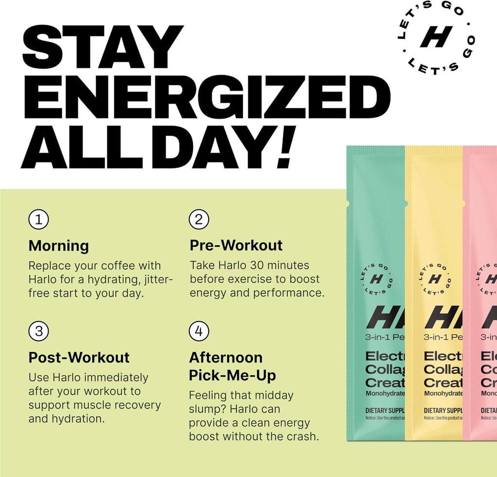About Harlo Introducing Harlo: the ultimate powdered drink supplement designed to elevate your wellness and workout routine. Crafted with precision, Harlo's innovative blend combines essential electrolytes, high-quality collagen, and pure creatine to offer a zero-sugar formula that's your perfect fitness ally. Say goodbye to artificial additives – Harlo features clean ingredients that are gluten-free, paleo, and keto-friendly, ensuring you get only the best for your body. With Harlo's 3-in-1 electrolytes, collagen, and creatine blend, you'll stay at the top of your game, whether you're hitting the gym or tackling daily challenges. Elevate your wellness journey with Harlo and experience the difference it can make in your performance, recovery, and overall vitality. Take the first step towards a healthier, happier you with Harlo – your ultimate fitness companion! Specifications Flavors: Citrus, Pineapple, Raspberry, & Watermelon