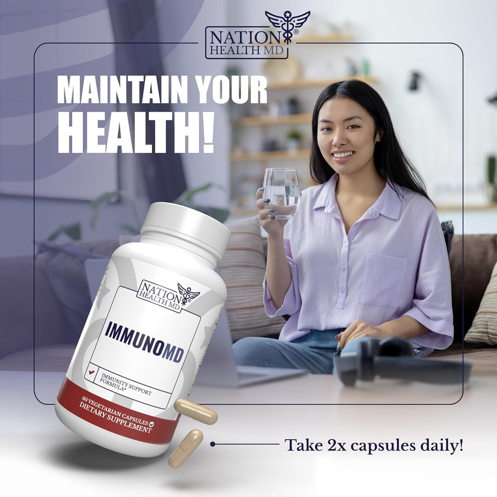 - IMMUNITY SUPERSTAR! IMMUNO MD by Nation Health MD is jam-packed with core natural nutrients to help support healthy immune functions at the cellular level. Potent vitamins, enzymes, amino acids, polyphenols, flavonoids, and antioxidants. Nation Health MD only uses premium quality ingredients, scientifically proven to WORK!