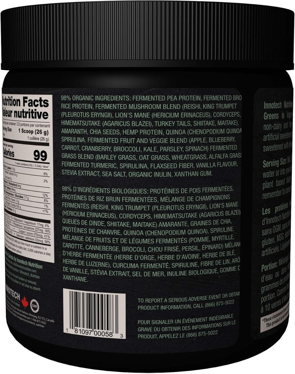 98% Organic Ingredients: Fermented Pea Protein, Fermented Brown Rice Protein, Fermented Mushroom Blend (Reishi, King Trumpet (Pleurotus eryngii), Lion's Mane (Hericium erinaceus), Cordyceps, Himematsutake (Agaricus blazei), Turkey Tails, Shiitake, Maitake), Amaranth, Chia Seeds, Hemp Protein, Quinoa (Chenopodium quinoa), Spirulina. Fermented Fruit and Veggie Blend (Apple, Blueberry, Carrot, Cranberry, Broccoli, Kale, Parsley, Spinach) Fermented Grass Blend (Barley Grass, Oat Grass, Wheatgrass, Alfalfa Grass), Fermented Turmeric, Spirulina, Flaxseed Fiber, Flavour*, Stevia Extract*, Sea Salt, Organic Inulin, Xanthan Gum*. *Not organic.