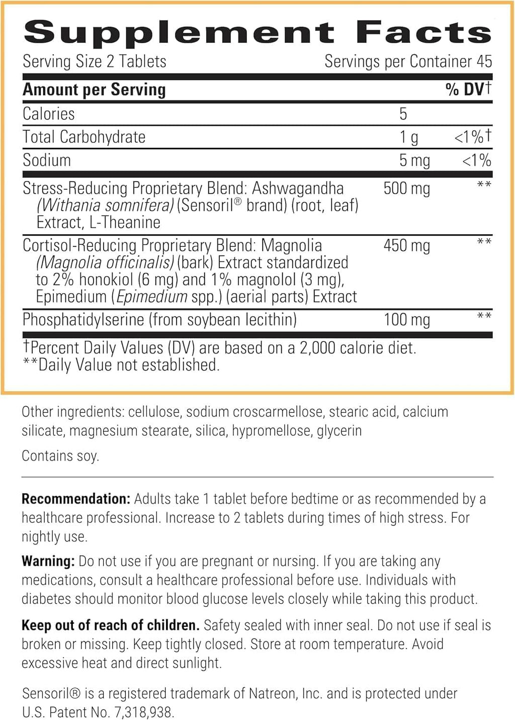 Calories, Total Carbohydrate, Sodium, Stress-Reducing Proprietary Blend: Ashwagandha Extract, L-Theanine, Cortisol-Reducing Proprietary Blend: Magnolia Extract standardized to 2% honokiol (6 mg) and 1% magnolol (3 mg), Epimedium Extract, Phosphatidylserine, Other ingredients: cellulose, sodium croscarmellose, stearic acid, calcium silicate, magnesium stearate, silica, hypromellose, glycerin, Contains soy.