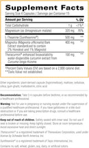 Magnesium (as magnesium lysinate and glycinate)320 mg76%, L-Theanine (Suntheanine)500 mg, Magnolia (Magnolia officinalis) Bark Extract standardized to contain 2% honokiol and 1% magnolol400 mg, Theracurmin (d bioavailability water-dispersible Turmeric (Curcuma longa) Rhizome Complex) providing 30% Curcumin, Other ingredients: hydroxypropyl methylcellulose (vegetable capsule), cellulose, maltose, silicon dioxide, gum ghatti, dextrin, citric acid