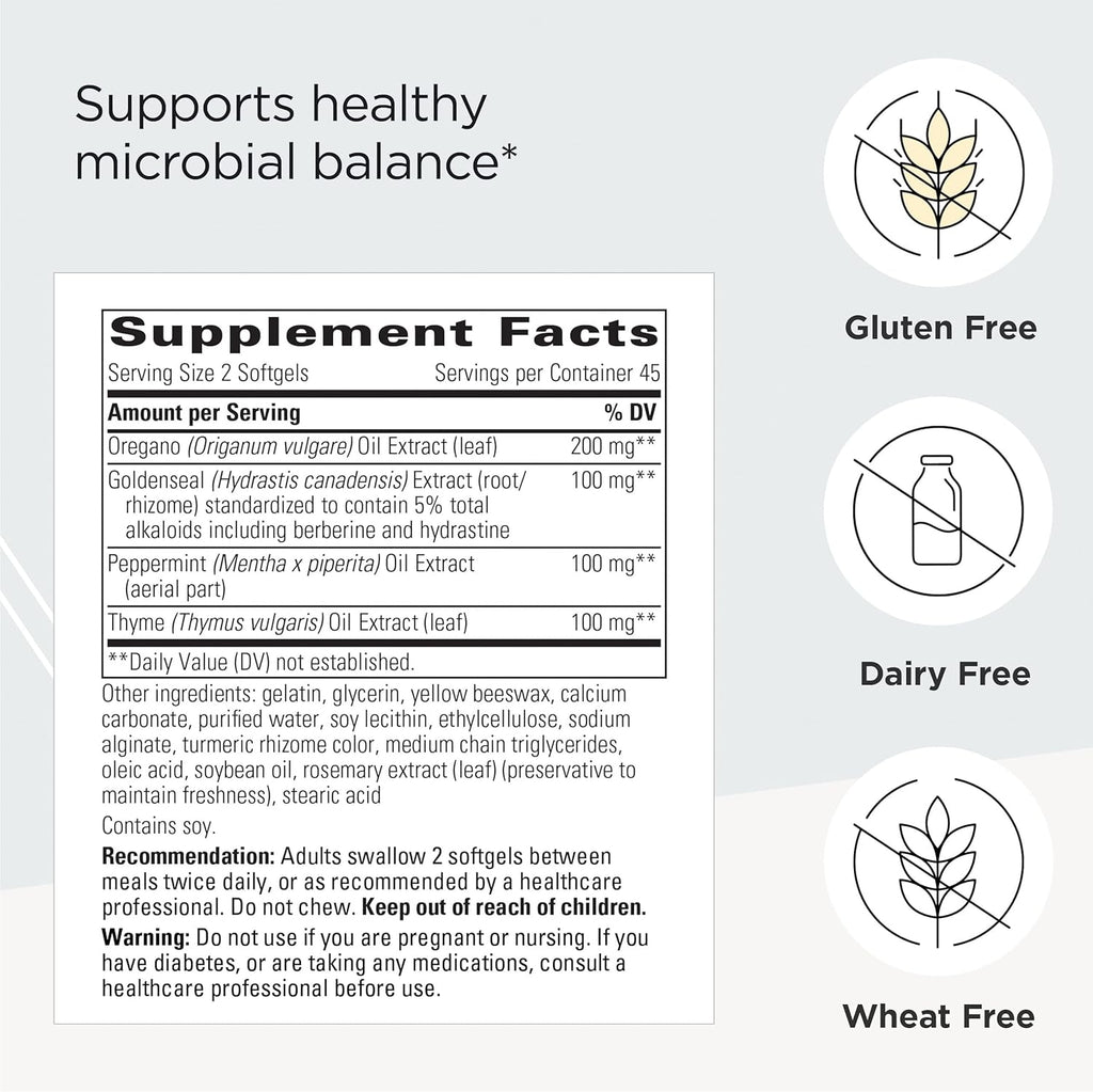 Oregano Oil Extract, Peppermint Oil Extract, Thyme Oil Extract (leaf) 0.1 mL, Goldenseal (Hydrastis canadensis) Extract (root rhizome) standardized to contain 5% total alkaloids including berberine, hydrastine and canadine 100 mg. Other Ingredients: gelatin, glycerin, yellow beeswax, purified water, soy lecithin, sodium alginate, ethylcellulose, titanium dioxide color, turmeric rhizome color, medium chain triglycerides, oleic acid, rosemary leaf oil extract, stearic acid. Contains soy.