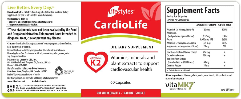 - 9 HEART HEALTHY INGREDIENTS - CardioLife is a scientifically formulated dietary supplement for adult men and women with 9 powerful ingredients that support heart and blood vessel health: Vitamin K2 called vitaMK7, Hawthorn Extract, Cocoa Powder, Red Beet Root Extract, Cayenne Pepper Extract, Magnesium Citrate, Folic Acid, Vitamin B6, Vitamin B12.