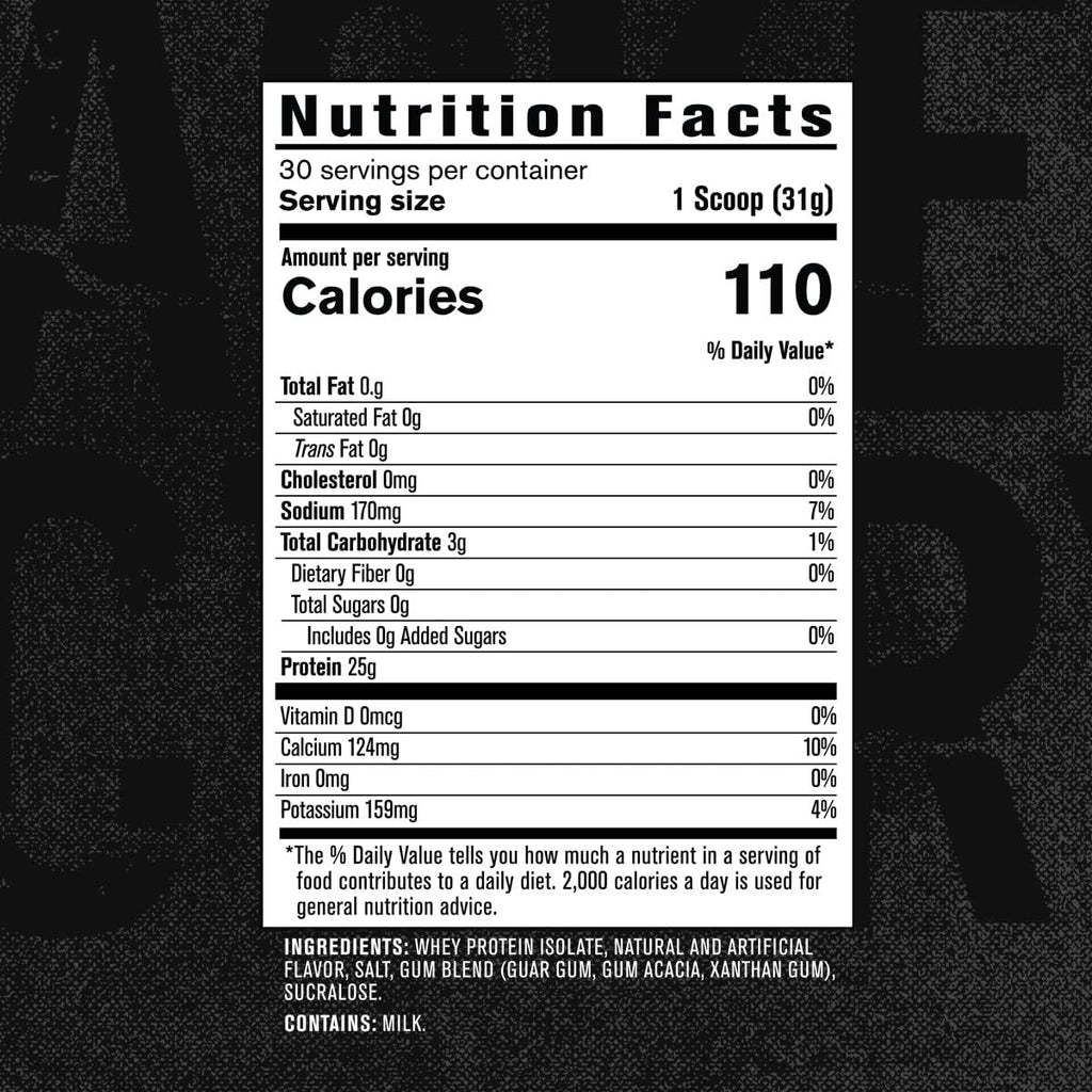 Per Serving (1 Scoop): Whey Protein Isolate, Natural and Artificial Flavor, Salt, Gum Blend (Guar Gum, Gum Acacia, Xanthan Gum), Sucralose. Contains: Milk.