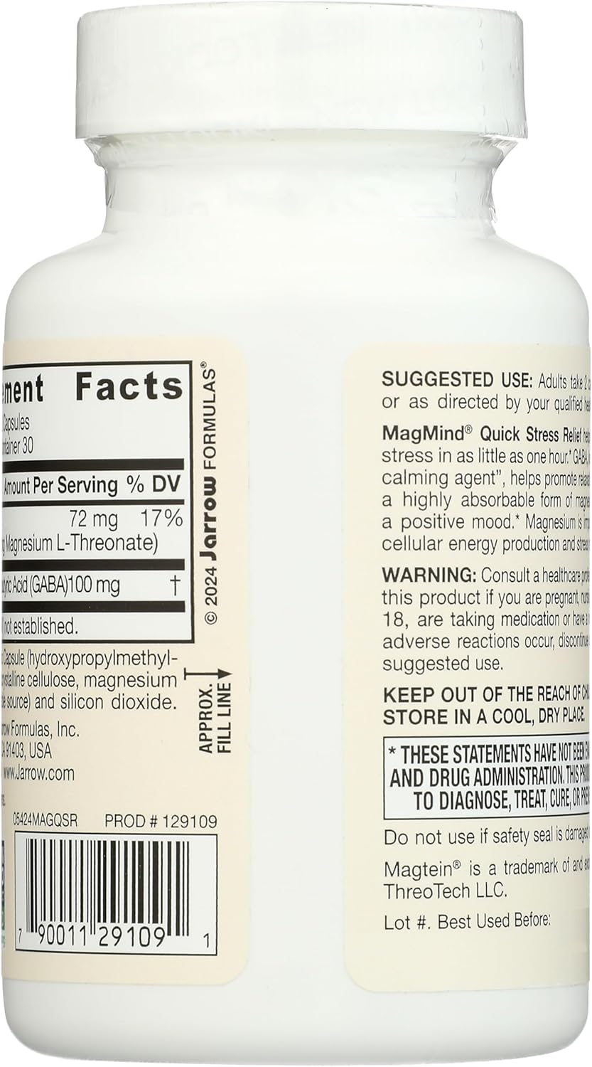 - STRESS RELIEF FORMULA: Jarrow Formulas MagMind, Quick Stress Relief, features GABA and 1 g of Magtein Magnesium L-Threonate per serving, a highly absorbable form of magnesium; it helps reduce occasional stress in as little as one hour(1)