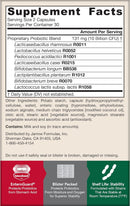 Proprietary Probiotic Blend (Lacticaseibacillus rhamnosus R0011, Lactobacillus helveticus R0052, Pediococcus acidilactici R1001, Lacticaseibacillus casei R0215, Bifidobacterium longum BB536, Lactiplantibacillus plantarum R1012, Bifidobacterium breve R0070, Lactococcus lactis subsp. lactis R1058), Potato starch, capsule (hydroxypropylmethyl-cellulose, water), enteric coating (hypromellose, ethylcellulose, sodium alginate, medium chain triglycerides [modified coconut oil], oleic acid, stearic acid [vegetable source]), magnesium stearate (vegetable source) and ascorbic acid (antioxidant). Contains: Milk and soy (in trace amounts).