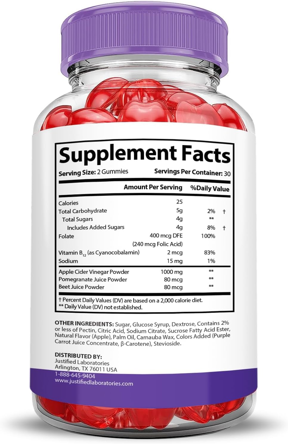 Total Carbohydrate, Total Sugars, Added Sugars, Folate (Folic Acid), Vitamin B12 (as Cyanocobalamin), Apple Cider Vinegar, Pomegranate Juice Powder, Beet Juice Powder. OTHER INGREDIENTS: sugar, Glucose syrup, Dextrose. Contains, or less of Pectin, Citric Acid, Sodium Citrate, Sucrose Fatty Acid Ester, Natural Flavor (Apple), Palm Oil, Carnauba Wax. Colors Added (Purple, Carrot Juice Concentrate, ß-Carotene), Stevioside.
