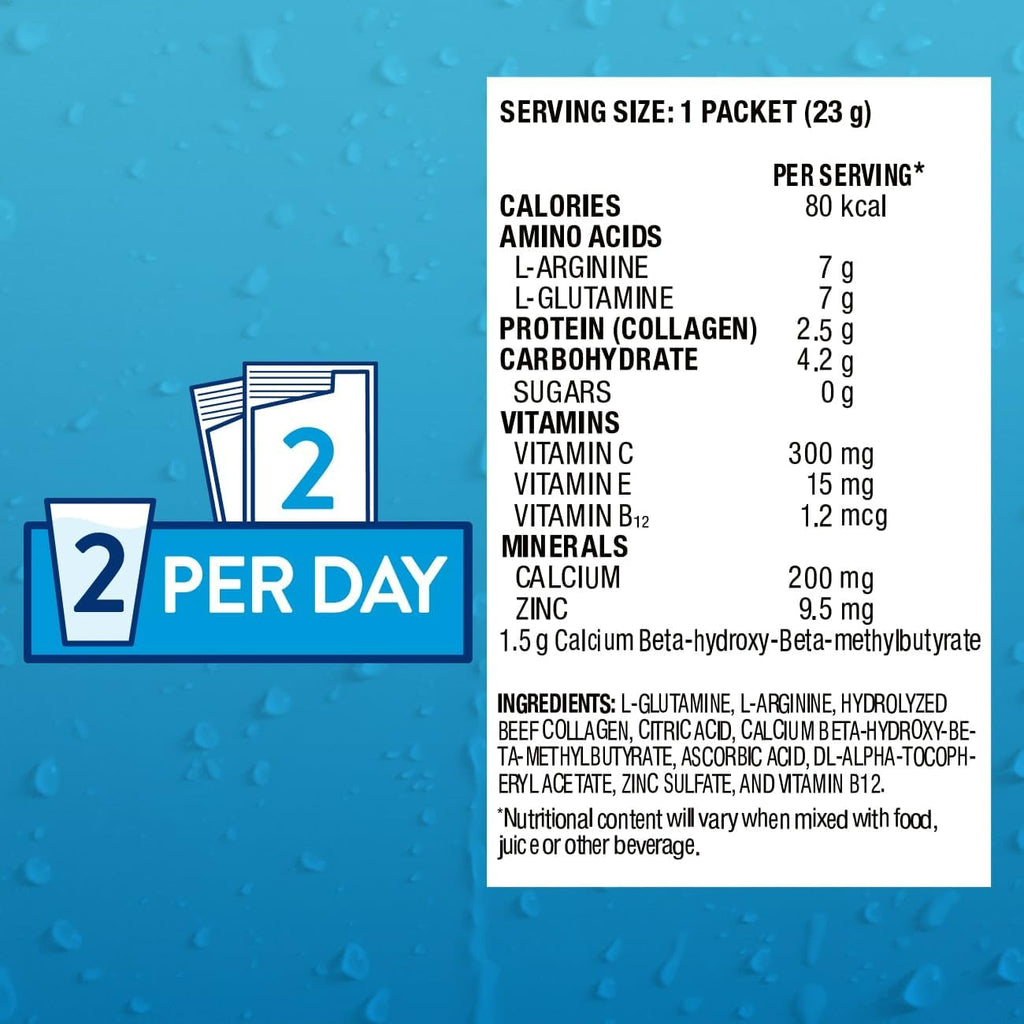 L-Glutatamine, L-Arginine, Hydrolyzed Beef Collagen, Citric Acid, Calcium Beta-Hydroxy-Beta-Methylbutyrate, Ascorbic Acid, di-Alpha-Tocopheryl Acetate, Zinc Sulfate, and Vitamin B12